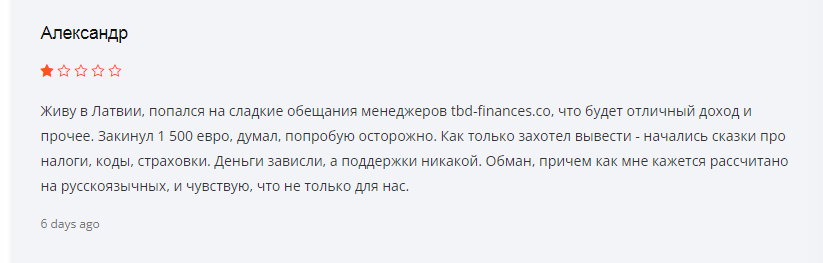 Судя по отзывам о Tbd Finances Co клиентов, этот брокер фейковый. Они жалуются на то, что он не дает вывести деньги, требует новые взносов под предлогом платной верификации, комиссий и пр.