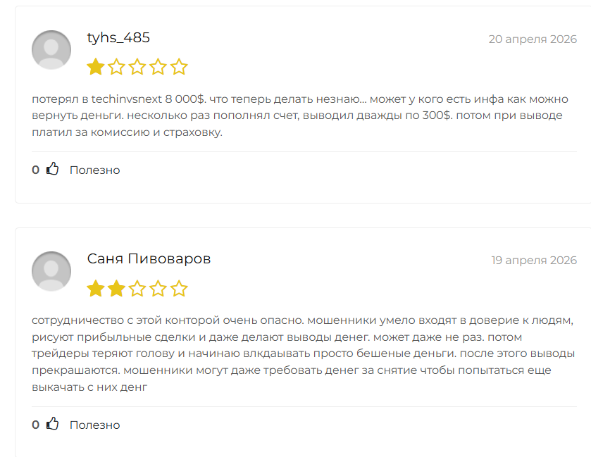 При сотрудничестве с TechInvsNext видно определенные риски, которые могут стать причиной опустевшего кошелька, поэтому мы советуем держаться подальше от такого проекта, ведь о нем практически нет информации, а как зарегистрироваться, непонятно.