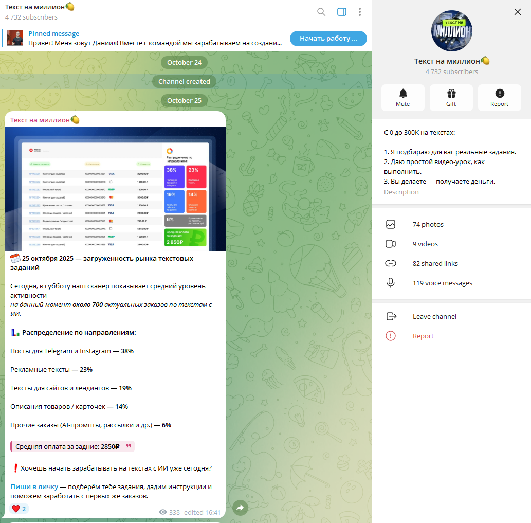 Очередной развод от Даниила: канал «Текст на миллион» с мёртвой аудиторией и сомнительными обещаниями лёгкого заработка на копирайтинге через ИИ.
