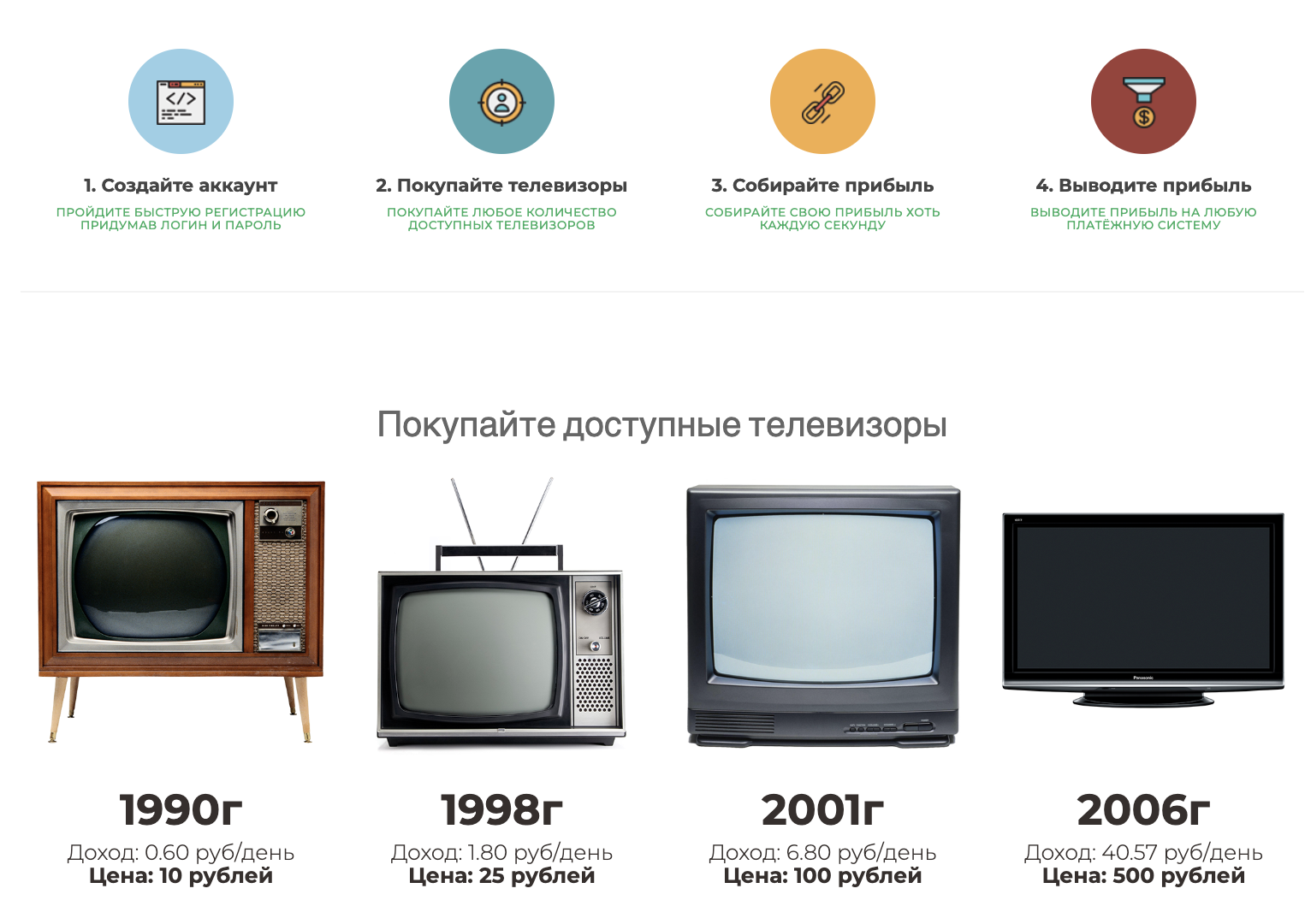 Минимальная инвестиция составляла 10 рублей. Купившему «телевизор» по такой цене пользователю, обещали начислять по 60 копеек в сутки.