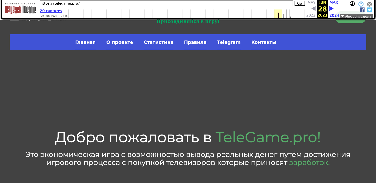 На всех остальных снэпшотах сайта telegame pro присутствует заглушка хостера. Исходя из этого, делаем вывод, что игра проработала всего несколько месяцев, а значит с высокой вероятностью проект изначально задумывался как скам.