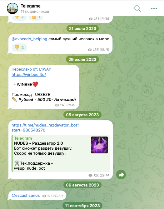 В Телеграмме по-прежнему существует канал Telegame. Он размещается по адресу t me telegame pro и, на 20 апреля 2026-го года насчитывает 11 подписчиков.