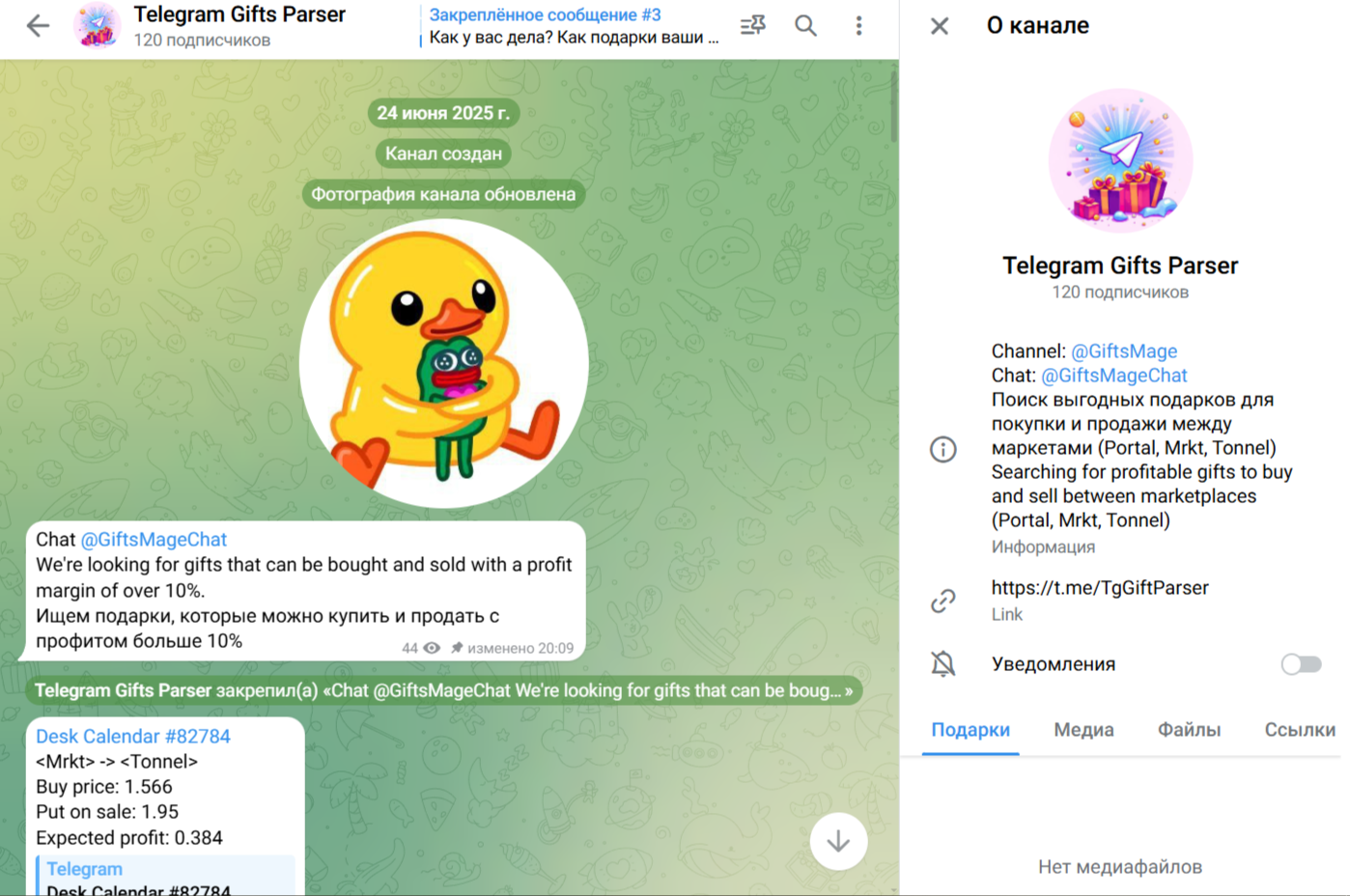 Еще совсем недавно основной целью проекта в мессенджере было выявление и предоставлении информации об арбитраже NFT-подарков. С помощью полученной информации подписчики могли осуществить сделки покупки на одном маркетплейсе и продажи на другом с приличным доходом. Посредством телеграм-канала Telegram Gifts Parser покупались и продавались:
