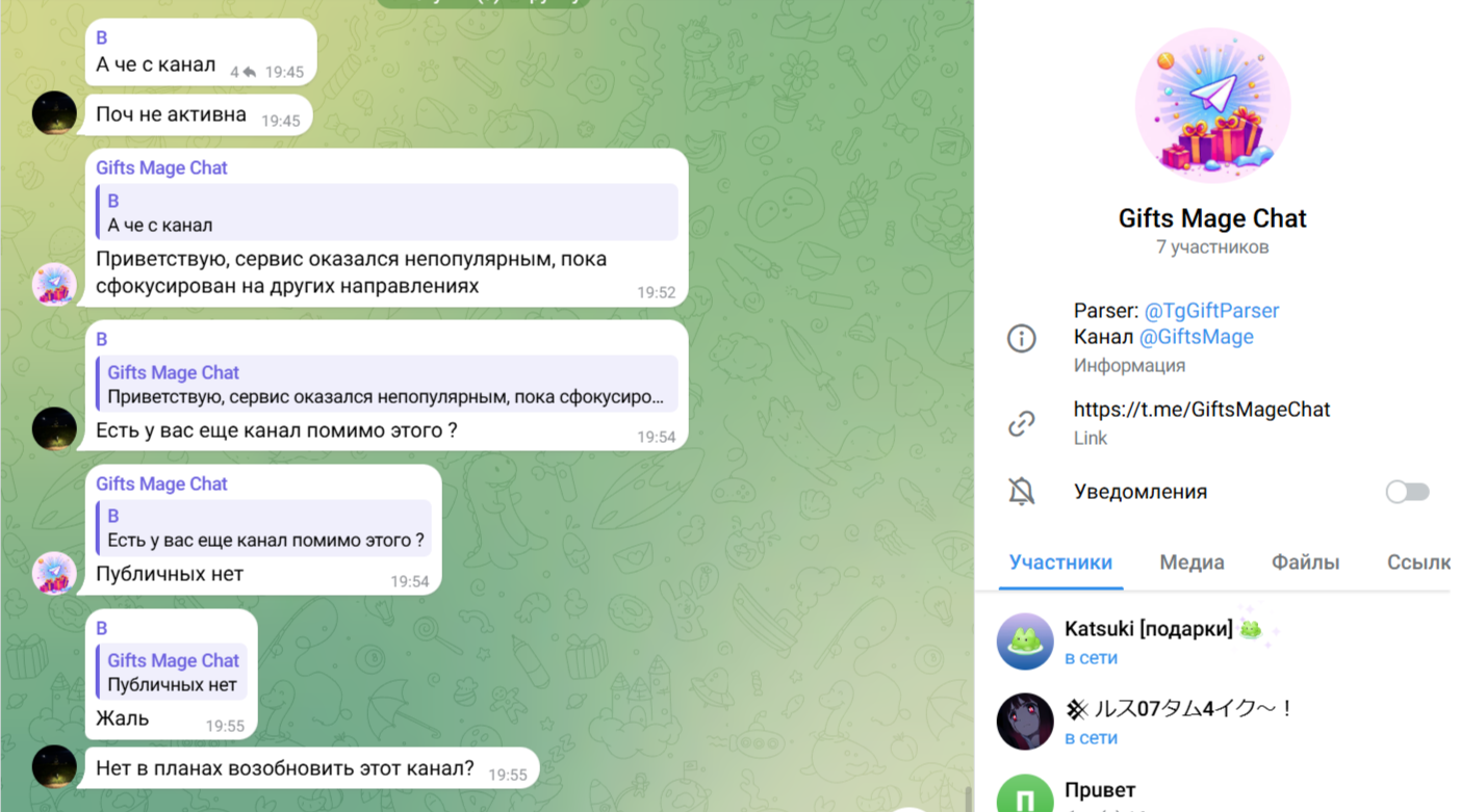 Некоторое количество отзывов о данном проекте наша команда обнаружила на ресурсе Gifts Mage Chat (Gifts Mage). Здесь пользователи не слишком активно обсуждали взаимодействие с маркетплейсами, собственные подарки и завершение карьеры телеграм-канала.