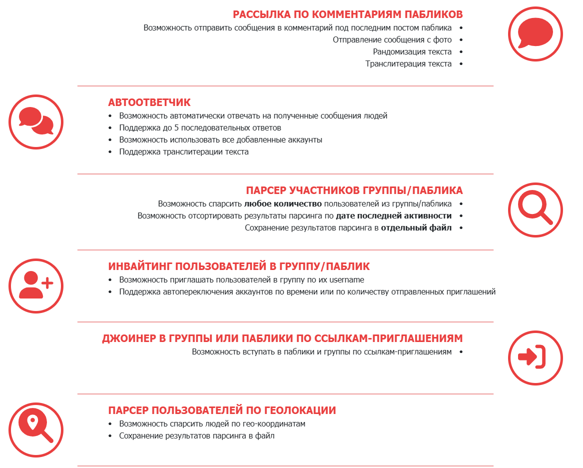 Пользователи могут установить ПО для не самого качественного, но в некотором роде действенного продвижения в Телеграм – через спам. В функции бота вложен целый набор решений для реализации спам-рассылок: