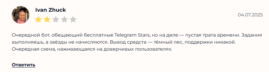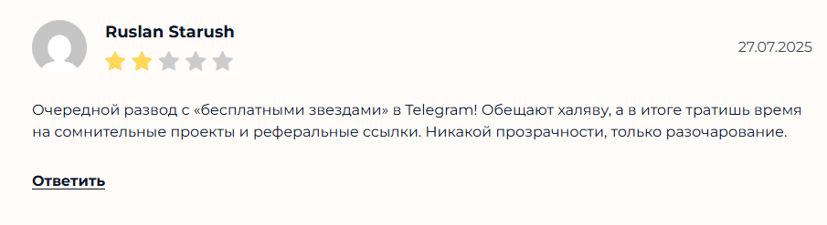 Очередной развод с «бесплатными звездами» в Telegram! Обещают халяву, а в итоге тратишь время на сомнительные проекты и реферальные ссылки. Никакой прозрачности, только разочарование.