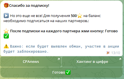 После подписки и подтверждения, пользователям выкладывают сведения о возможности дополнительно заработать 500 звезд. Здесь уже нужно подписаться лишь на 2 канала: