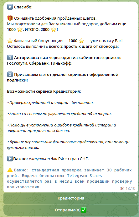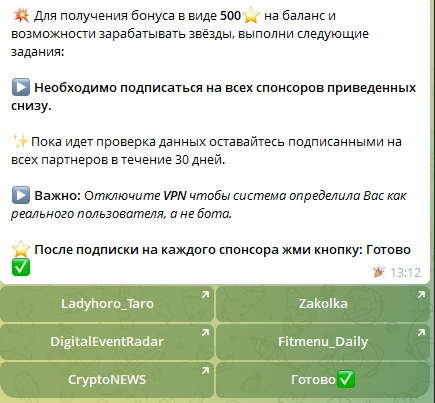 За подписку на 5 каналов пользователь должен получить 500 звезд. Это выглядит крайне подозрительно. Получается, что каждый канал готов платить за 1 подписчика более 165 рублей. Но это просто не может быть правдой, так как это нецелевой подписчик. Можно воспользоваться любым сервисом накрутки и нагнать тысячи ботов за ту же сумму.