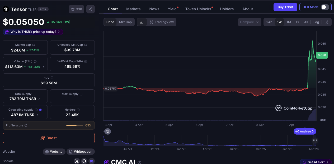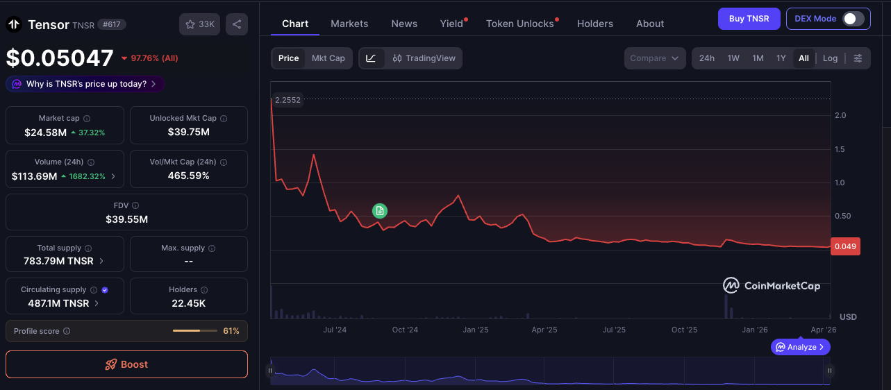 Летом 2024 года на рынок вышел токен управления экосистемой TNSR. Практически вся его история связана с падением курса. К 2026 году он обесценился больше чем на 97%.