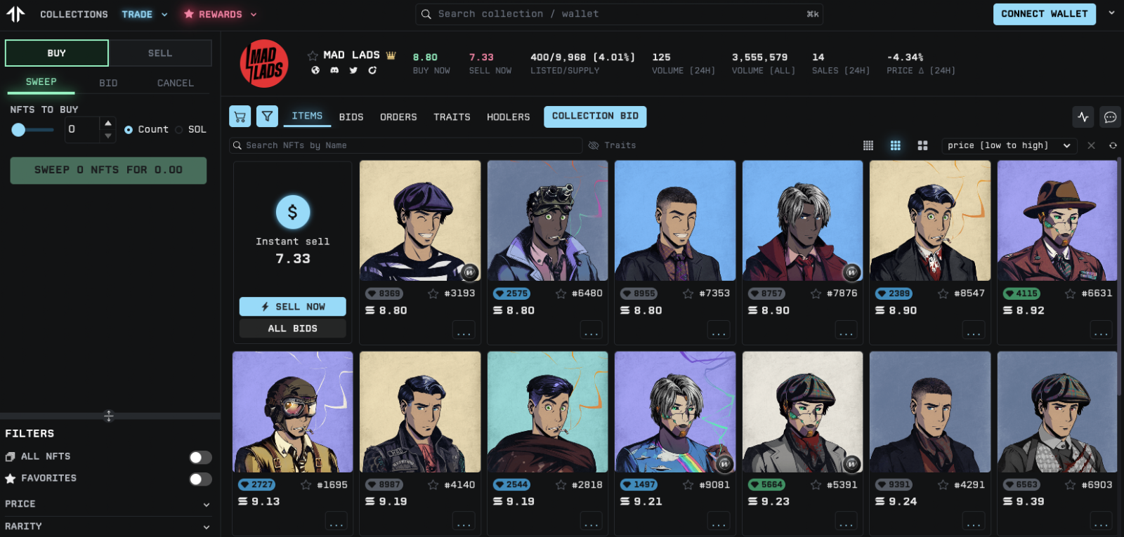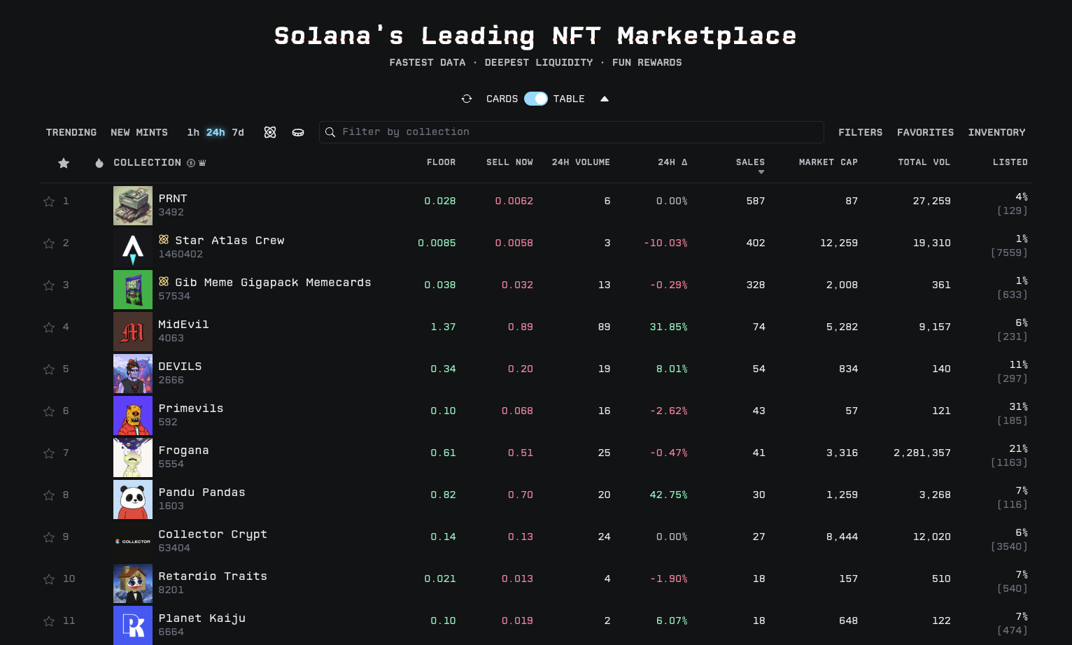 За последние 24 часа было совершено достаточно много сделок. Только в основном продаются дешевые токены, по цене менее 0,1 SOL.