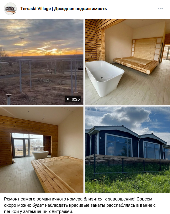 Это клубный закрытый поселок, где можно купить коттедж с целью его будущей аренды. Инвестору базы отдыха Терраски Парк гарантируется постоянный пассивный доход. Вопросами привлечения арендаторов и управления недвижимостью компания Terraski Village принимает на себя. На данный момент территория обустроена, часть коттеджей продана.