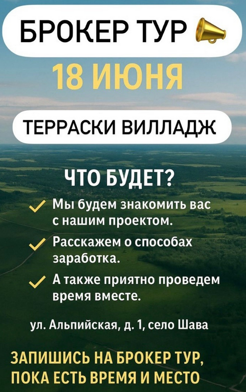 База Тераски Парк предлагается в качестве долгосрочной инвестиции. На территории регулярно проводятся брокер туры для потенциальных покупателей.