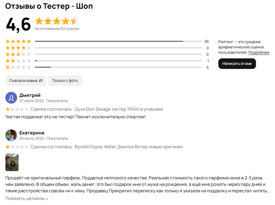 Независимые отзывы от покупателей о работе «Тестер Шоп Парфюмерия» нам удалось увидеть только на «Авито». Здесь в адрес источника оставлено всего 62 оценки, на основе которых его средняя оценка составляет 4,6/5. Все отзывы тут написаны в 2022 году. Последние оказались негативного характера. Пользователи обвиняют магазин в продаже подделок.