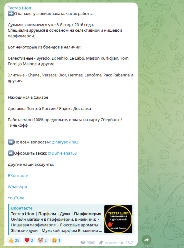 Спустя 2 года здесь появился небольшой ознакомительный пост, в котором указывается, что магазин «Тестер Шоп Парфюмерия с доставкой по России» работает с 2016 года. Он специализируется на селективных и нишевых духах. Отправляют товары из Самары, поэтому жители этого города могут оформить самовывоз продукции.