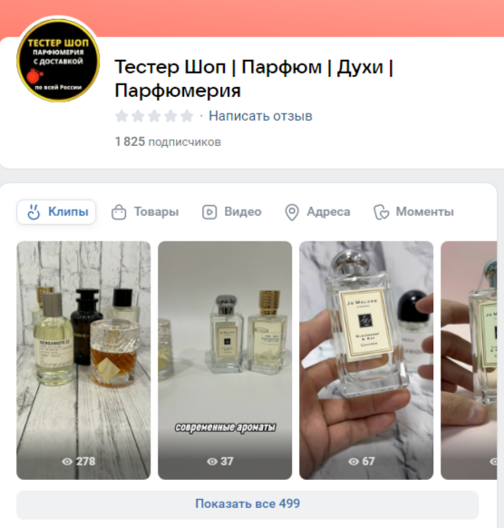 Во «Вконтакте» авторы выкладывают только фотографии и видеоролики с небольшим описание ароматов. Среди товаров находятся только селективные и нишевые парфюмы.