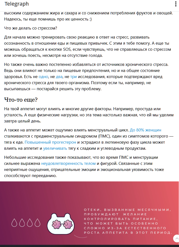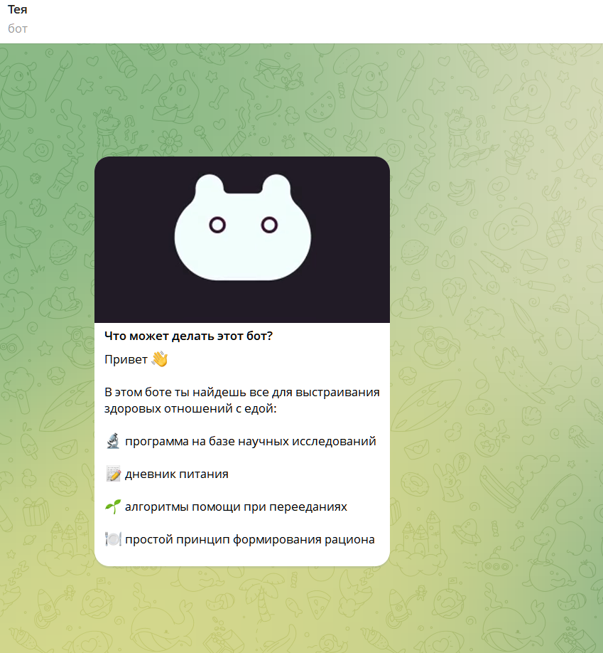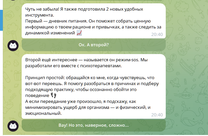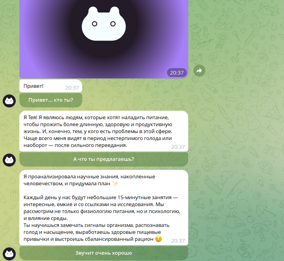 В принципе, в качестве информационного ресурса бот «Тея» можно протестировать. Но для корректировки веса, практик интервального голодания надежней обращаться к профильным специалистам с медицинским образованием.