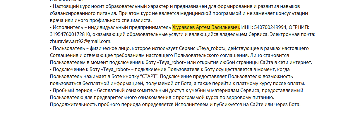 Блог бота «Тея» странный сайт на одну страницу. Для обратной связи есть только ссылка на ТГ канал бота. Деньги за использование программы переводятся на счет ИП Журавлев Артем Васильевич.