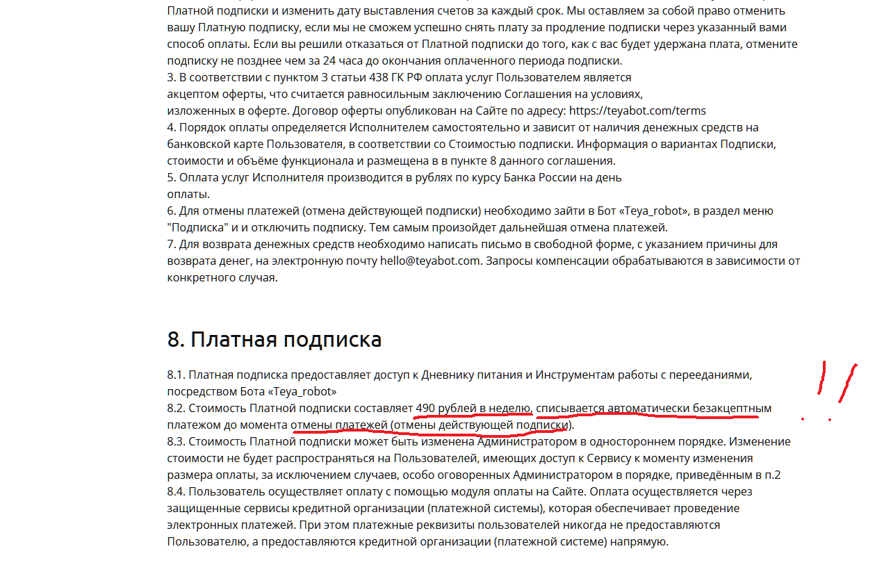 Пользователям важно обратить внимание, что в договоре оферты указано, что подписка на бот продлевается автоматически, деньги будут списываться с карты каждую неделю. Если человек хочет отказаться от подписки, необходимо отключить автоматическую подписку в своем банковском приложении.