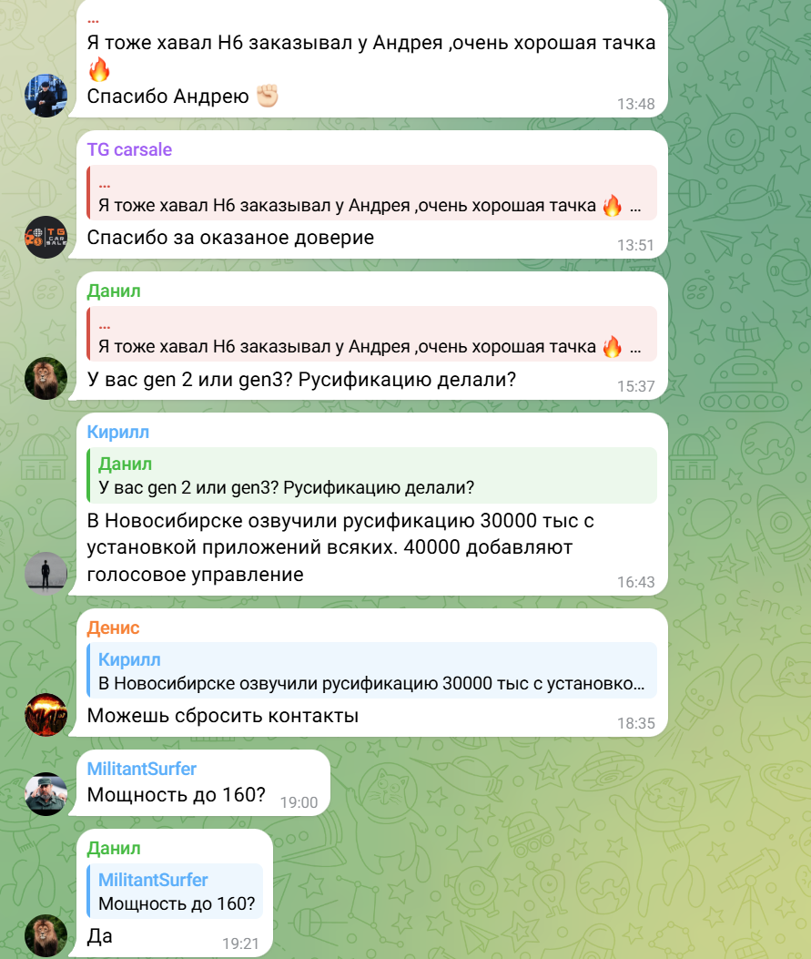 Компания Андрея Полежаева и Алексея Герасимова ориентирована на пригон машин из Китая под личные предпочтения клиентов. При этом к плюсам деятельности ТГ Карсале стоит отнести следующие моменты: