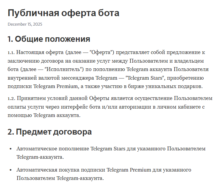 В меню бота можно перейти по ссылке на платформу Телеграф и просмотреть публичную оферту. Дата создание текста – 15 декабря 2025 года. На момент обзора прошло около полутора месяцев.