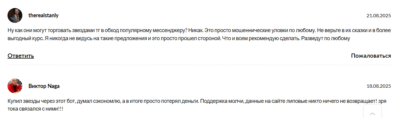 Проверить надежность бота Tgstarsbot невозможно, а его создатели не разглашают свои имена. Отзывов от реальных покупателей на момент написания нет. Заметим, что на просторах Telegram штампуются аналогичные боты, которые могут использовать различные мошеннические схемы для кражи переводов пользователей.
