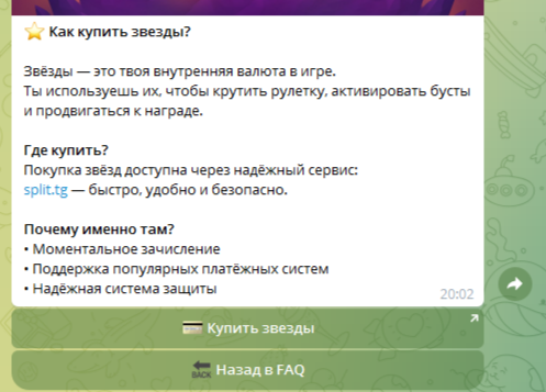 Основная внутренняя валюта игры Stars Bank Bot – это звезды. Они нужны для прокрутки рулетки, активации бустов и для продвижения к награде. Купить их можно на специальном сервисе, который авторы указывают в посте. По их словам, данный ресурс является надежным, быстрым и безопасным.