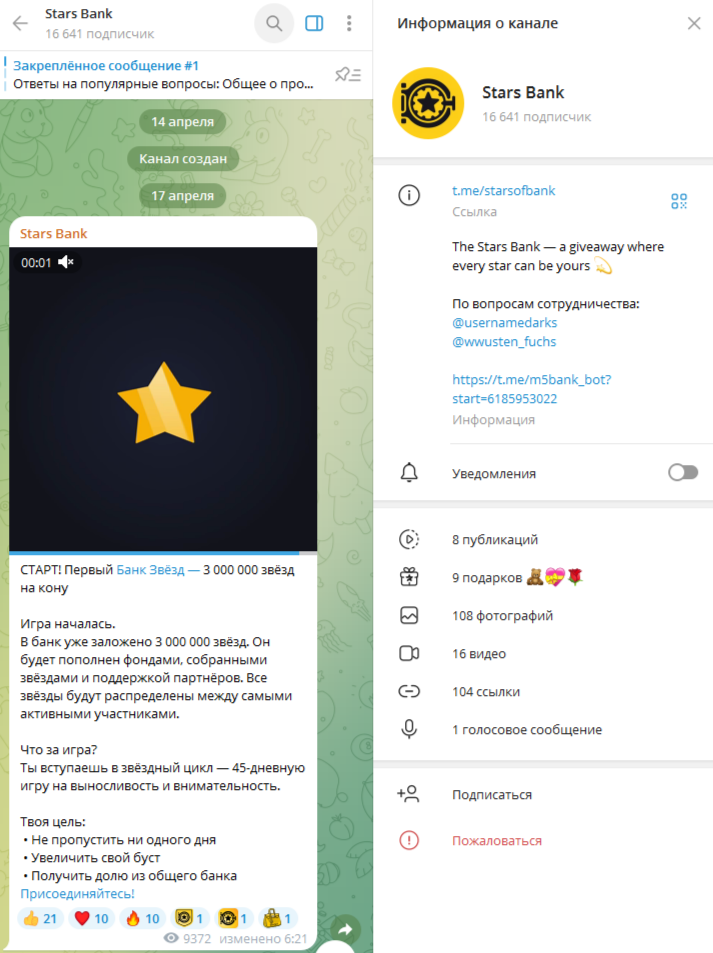Также мы узнали, что блог был запущен в апреле 2025 года. Скорее всего, в это время появился и сам проект. Мы решили узнать подробности о его работе на просторах интернета. Только оказалось, что он тут особо не упоминается. Отзывов о работе тг-канала «Старс Банк» The Stars Bank нет. За 4 месяца работы блог получил упоминание только в одной статье, причем в не лучшем свете. При этом, на блог подписано 16 тысяч зрителей, а ботом пользуются – 112 тысяч игроков.