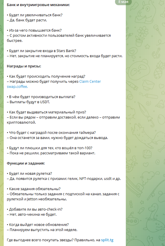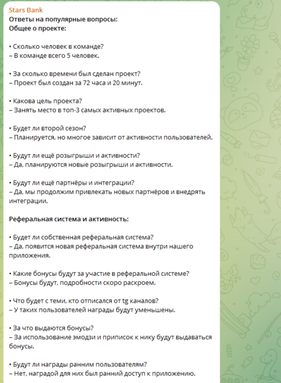 В основном тг-канале The Stars Bank мы нашли публикацию с ответами на большое количество вопросов. Так мы узнали, что данный проект был создан 5 людьми за трое суток. Их миссия – попасть в топ-3 самых активных разработок. В дальнейшем они планируют второй сезон, различные конкурсы, интеграции и коллаборации с партнерами.