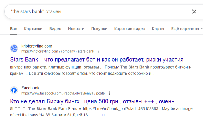Мы проверили работу проекта «Старс Банк» @ m5bank bot и можем предположить, что создан он был 4 месяца назад. Однако на просторах интернета о нем практически нет речи. Лишь в одной статье засветилось название данного бота. Причем это разоблачение его деятельности. Авторы пришли к выводу, что это небезопасный и сомнительный сервис.