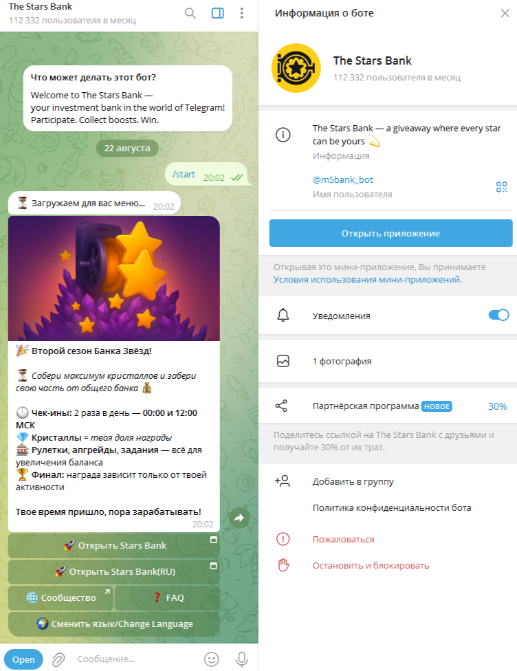 Проект работает как телеграм-бот Stars Bank Bot @ m5bank bot. При его запуске, пользователям приходит сообщение, в котором описаны некоторые характеристики ресурса. Однако, информативным его назвать трудно, так как не особо понятно, что представляет собой данная разработка.