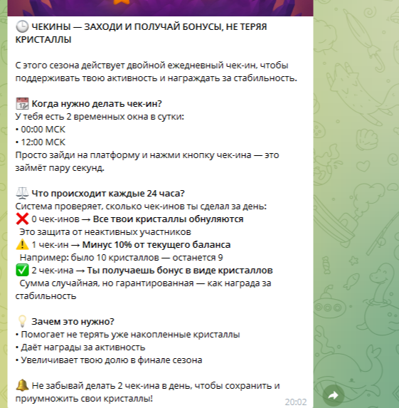 Если пропустить этот чек-ин, то можно лишиться всех ранее накопленных кристаллов. Если совершить один сбор валюты, то баланс уменьшается на 10%, если зайти два полноценных раза, то кристаллы не только остануться в банке, но и будут начислены дополнительно.