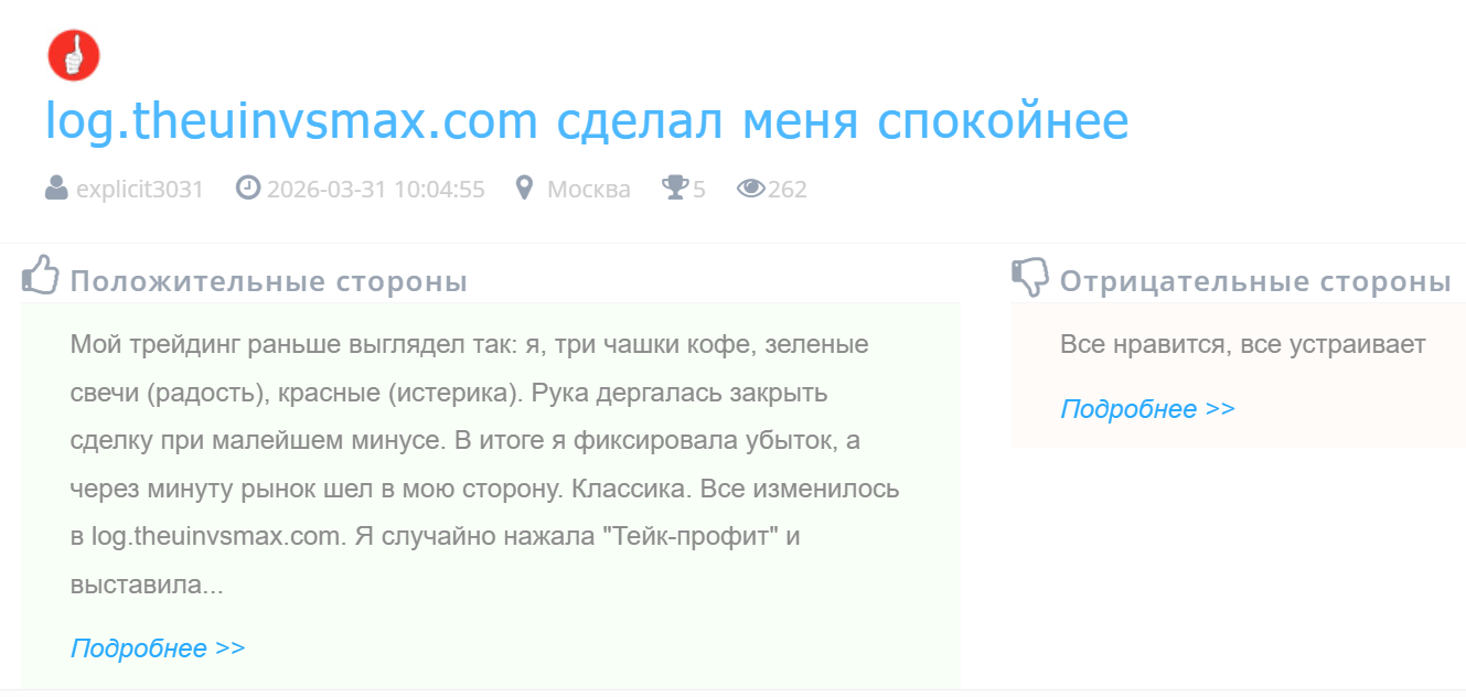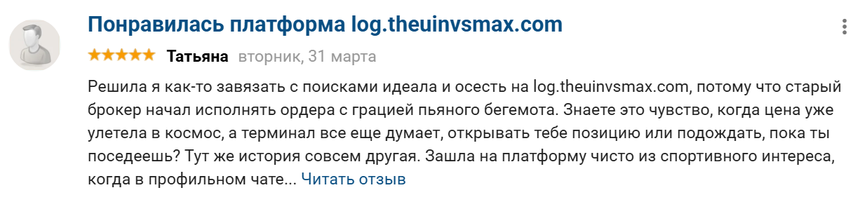 Несмотря на то, что платформа брокера выглядит очень подозрительно, о Theuinvsmax отзывы встречаются преимущественно позитивные. Они немногочисленные, но появляются на разных ресурсах. То, что данные комментарии являются фейковыми, выдает публикация примерно в одно и то же время и очень неестественное содержание. В некоторых случаях все будто переведено не лучшим автоматическим переводчиком. Реальные отзывы о log theuinvsmax com отсутствуют, что вполне объясняется коротким сроком существования.