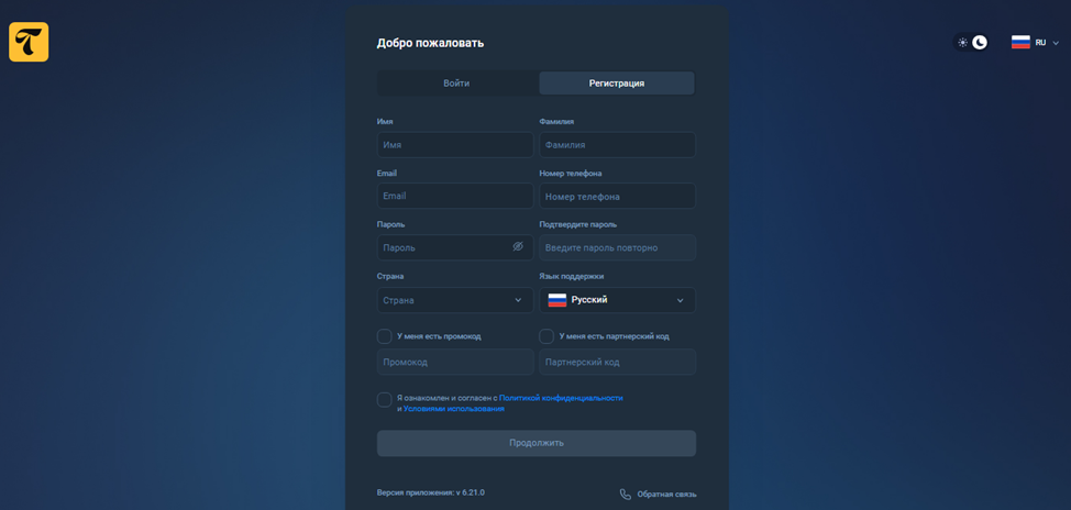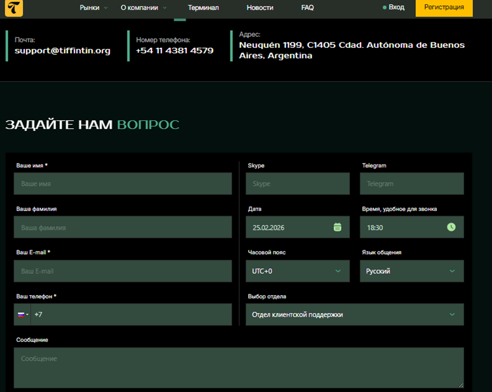 Для доступа к торговому терминалу необходимо заполнить анкету на странице Tiffin Tin Me. Система принимает любую информацию, не требуя прохождения проверки KYC. Подобный алгоритм не свойственен честным брокерам, которые дорожат своей репутацией и лицензией, но характерен для мошенников, которые хотят, чтобы клиент как можно быстрее перешел к пополнению счета.