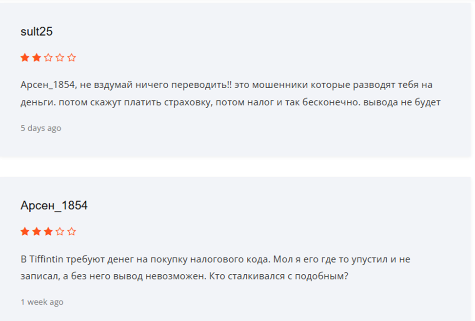Отзывы про «Тиффинтин» не сулят потенциальным пользователям ничего хорошего. Бывшие вкладчики предупреждают, что за брокером стоят мошенники, чья единственная задача — выманить из жертвы больше денег.