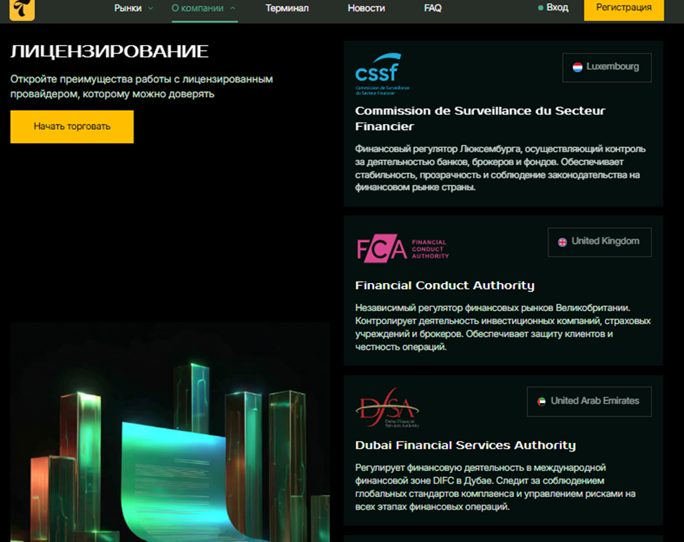 Несмотря на аргентинскую регистрацию, анонимные создатели проекта публикуют лицензии финансовых регуляторов FCA, CFFS, DFSA и VFSC.