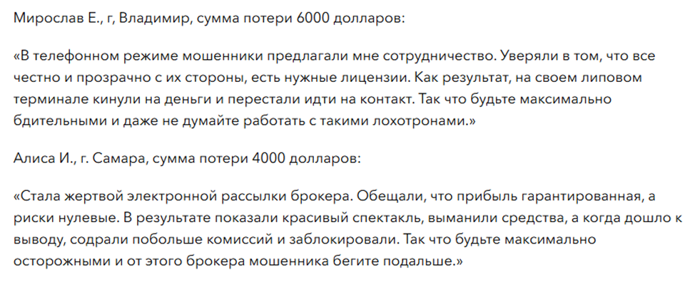 В отзывах, написанных как под копирку, отличается только суммы убытков, иногда достигающиих десятков тысяч долларов.