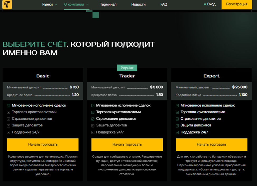 Торговые условия и статус аккаунта зависят от суммы депозита: