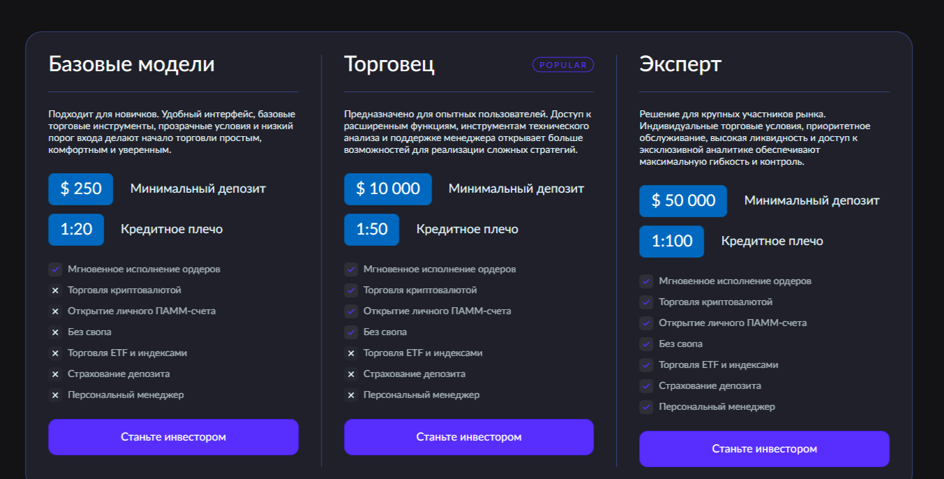 - Trader. Решение для трейдеров с опытом, платеж от 5 000 USD, личный ПАММ-счет, сделки с криптой, леверидж 1:50.