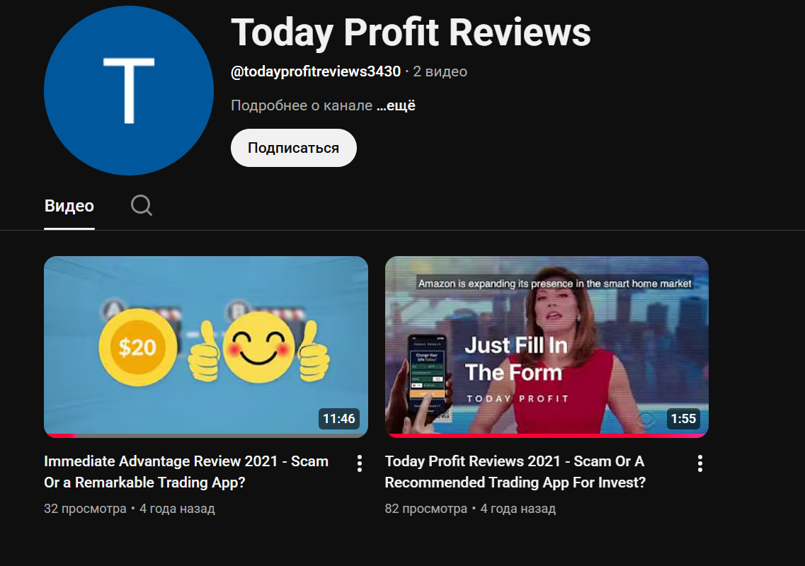 Сервис для заработка на крипте был запущен весной 2021 года, вместе с сайтом todayprofits был зарегистрирован еще один домен immediateadvantage site. Оба они имеют идентичный контент и созданы для единственной цели — развода на деньги доверчивых пользователей. В поддержку снято два видео, размещенных на Ютуб канале проекта. В них рассказана история конторы и раскрыта схема заработка.