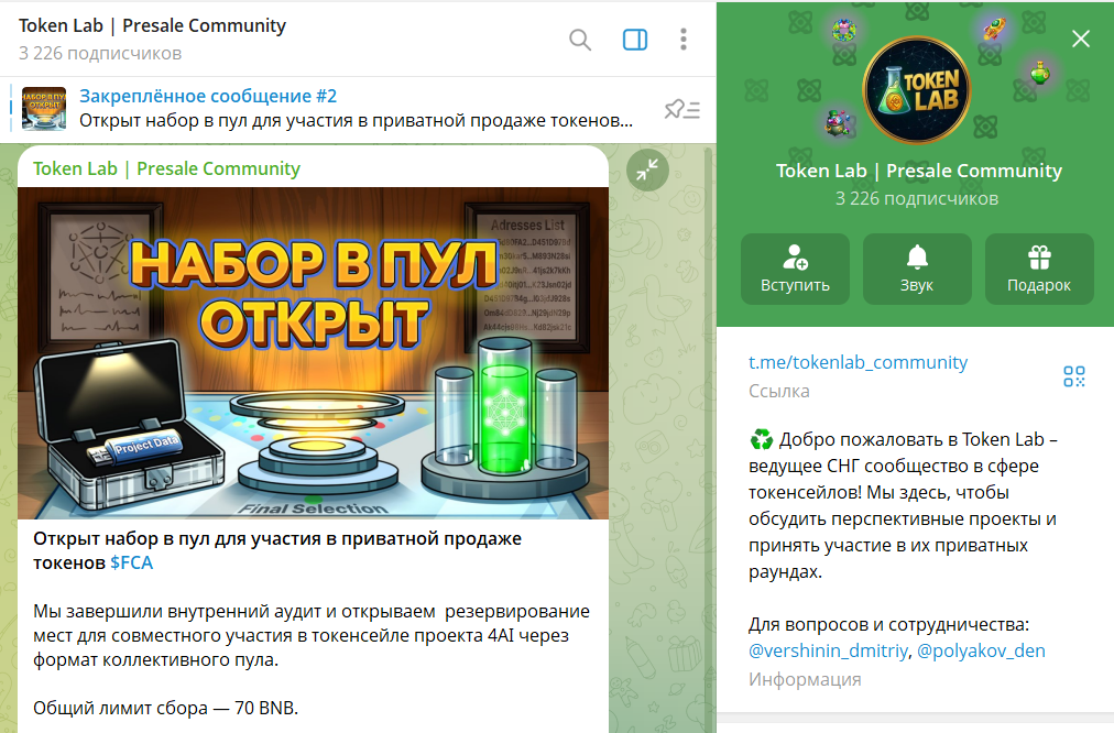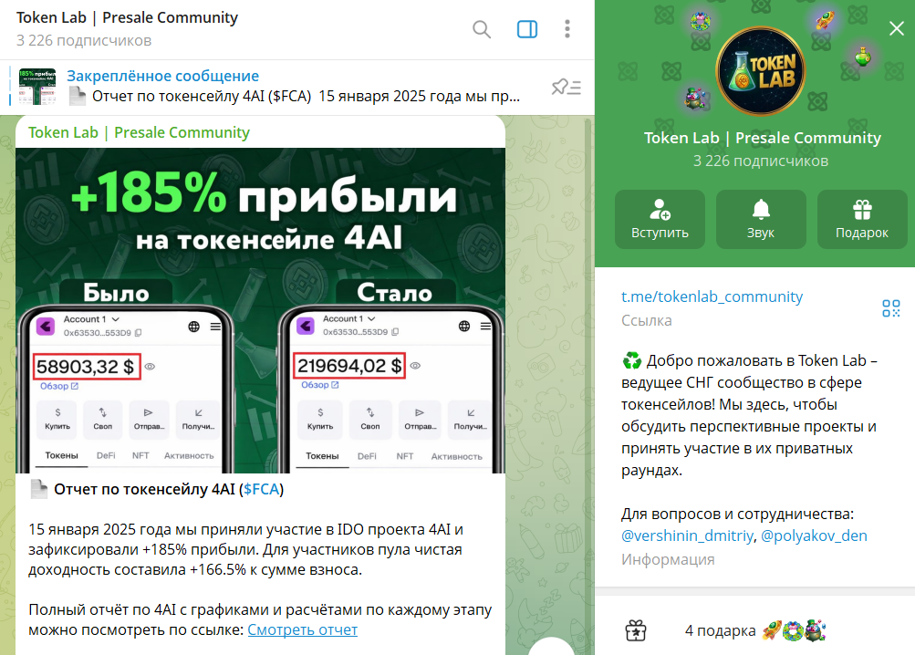 Анализ телеграмм-канала «Token Lab | Presale Community» и детали сотрудничества
