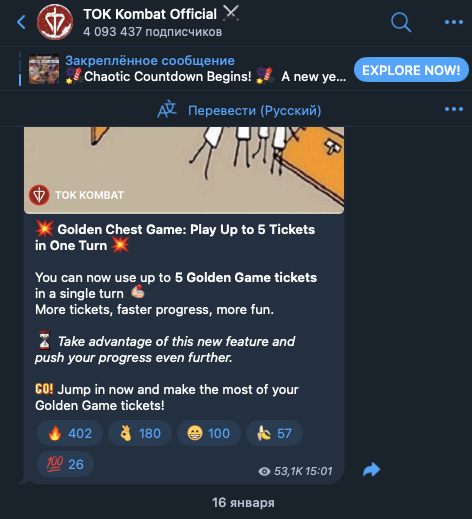 На 2 февраля 2026-го года на официальный телеграмм-канал игры, TOK Kombat Official подписаны 4,01 миллиона пользователей. Последние публикации в ленте получили в среднем по 50-60 тысяч показов и 500-700 реакций. Возможность оставлять комментарии под публикациями отключена.