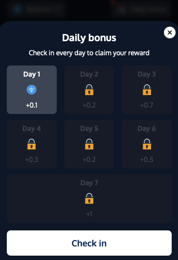 Также юзер может ежедневно забирать бонус. Для его получения нужно перейти в подраздел Daily bonus раздела Earn.