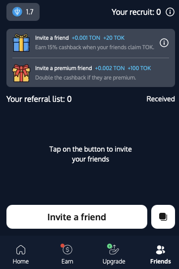 Если у привлеченного пользователя подключен телеграмм-премиум, то награду за него увеличивают до 0,002 TON и 100 TOK. Также партнеру выплачивают 15% от клейма всех ТОК его реферала.