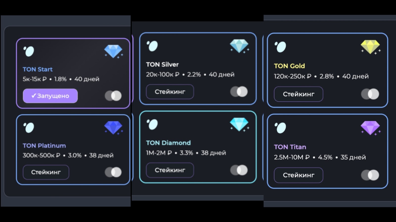 После того, как юзер создал аккаунт, сможет перейти к пополнению счета и выбору следующих тарифных планов Toninvest Network: