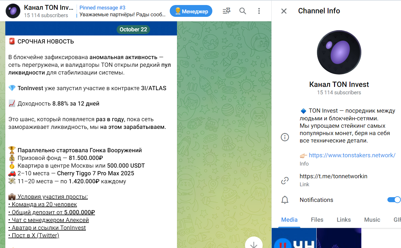 Телеграмм канал Ton Invest функционирует с сентября 2025 года, и здесь более 15k подписчиков.
