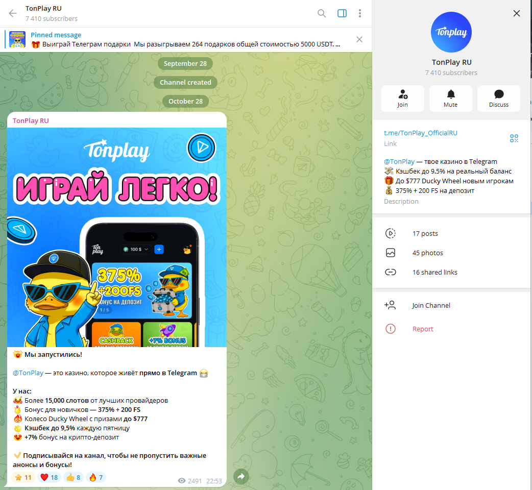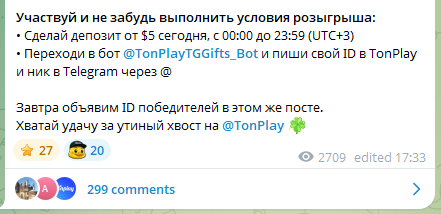 В Телеграмм-канале Ton Play в основном выкладываются новости проекта, информации о предстоящих розыгрышах, бонусах. Активным игрокам стоило бы на него подписаться, чтобы смотреть обзоры нововведений TonPlay Casino, забирать промокоды.