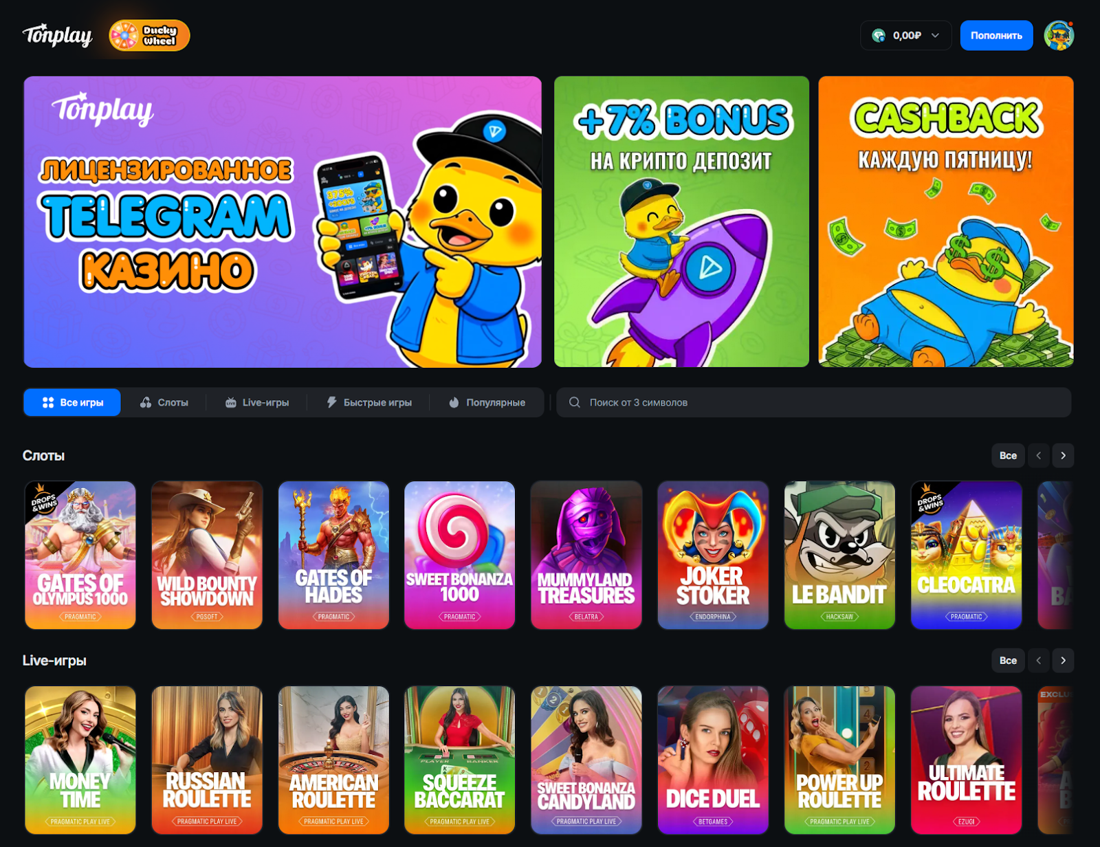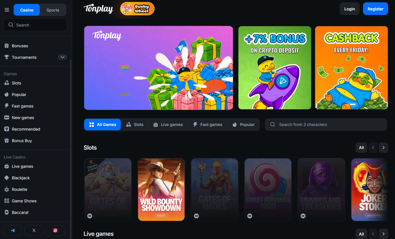 ТонПлей – стандартное оффшорное казино, которое запустили на базе Телеграм. Это может быть просто как вариант времяпровождения, но рассматривать его в качестве инструмента для заработка не стоит. Выделим основные моменты по обзору: