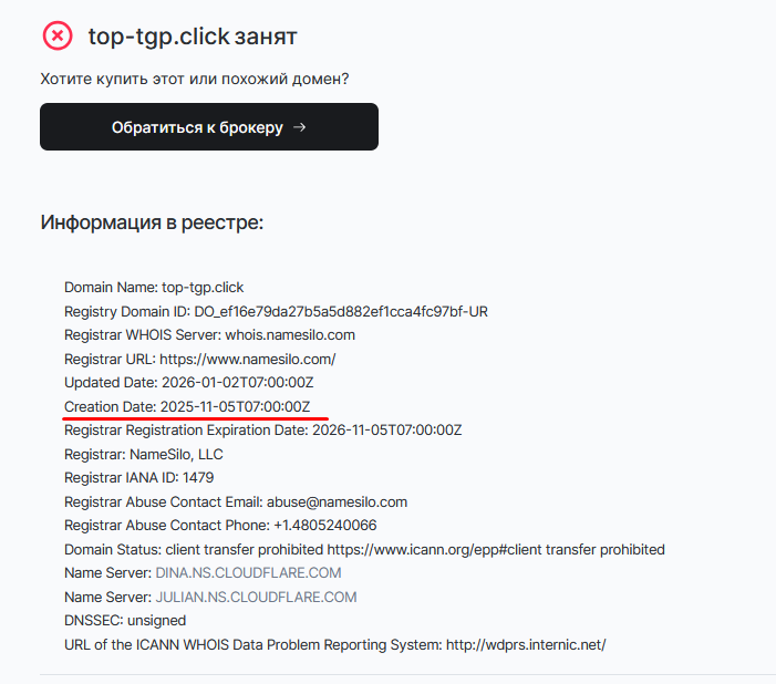 Анализ домена Top tgp click показал, что зарегистрировали его в ноябре 2025 года. То есть сайт совсем молодой.