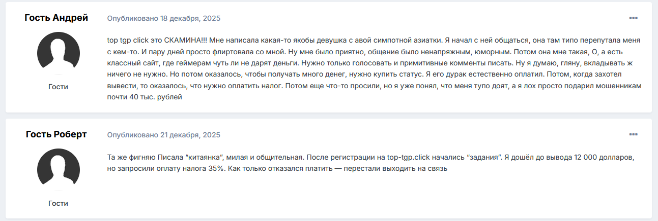 - Если верить отзывам о Top tgp click, то ресурс используется мошенниками для обмана интернет-пользователей. Правда, других доказательств, кроме комментариев, найти не удалось.