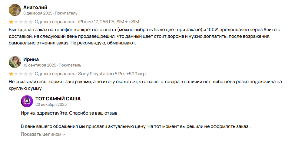 - наличие негативных отзывов о магазине Тот Самый Саша на Авито;